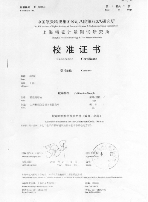 林頻與中國航天合作校準合格證書!