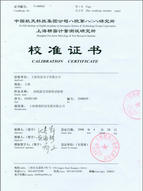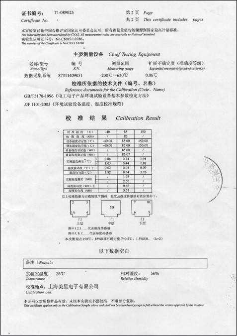 林頻股份與上海美星電子有限公司關于高低溫交變濕熱試驗箱校準報告