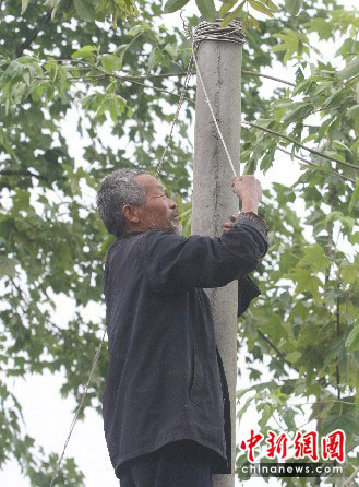 5月7日,此次強風雹暴雨災害重災區——重慶市墊江縣沙坪鎮李白村,一名受災群眾積極自救接通在災害中受損的電線。